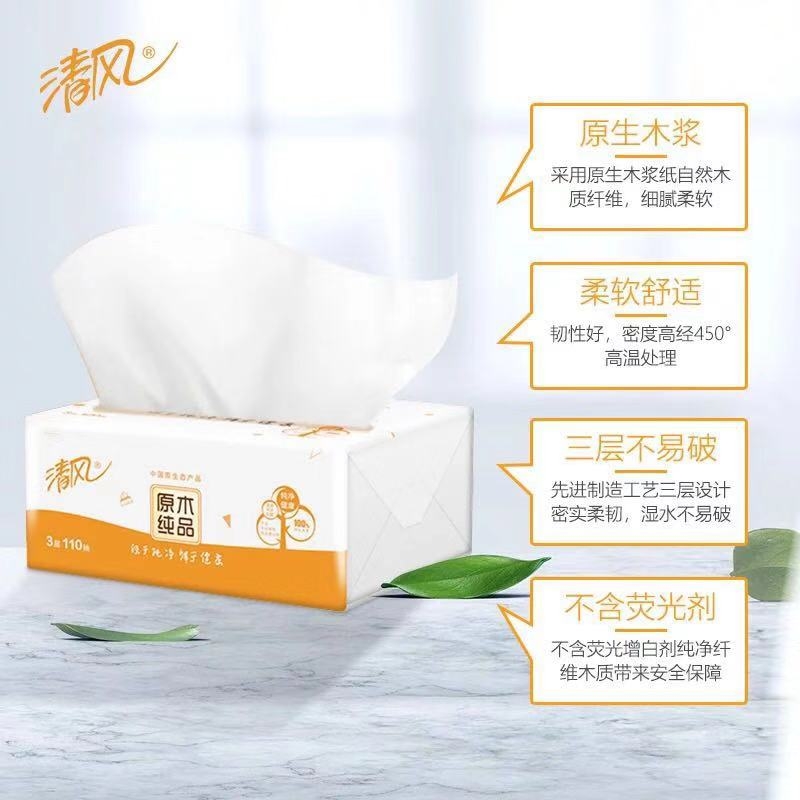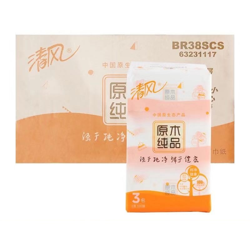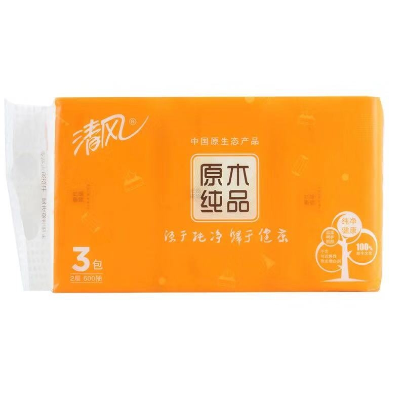 清风 Breeze 原木纯品抽取式面巾纸 软抽纸 T20808 双层 200抽/包 3包/提 16提/箱