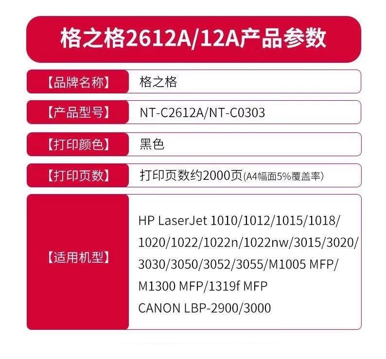格之格 G&G 格之格NT-CN2612T易加粉硒鼓12A 适用hp Q2612A惠普1005 1020 1010 3050 1018 3015 易加粉 单支装-2000页