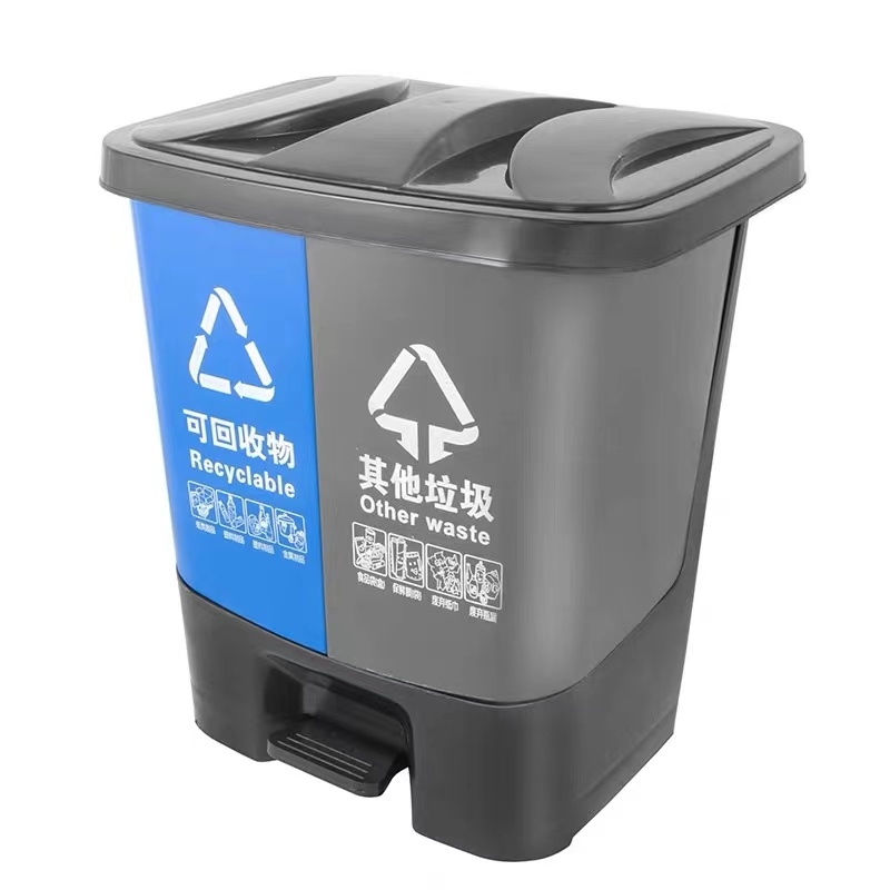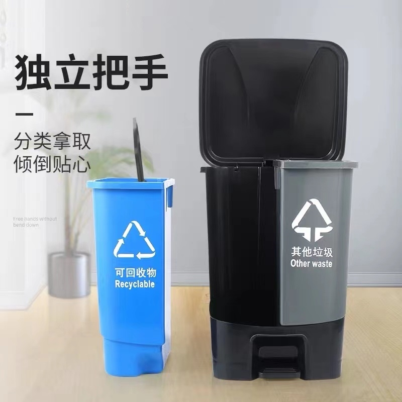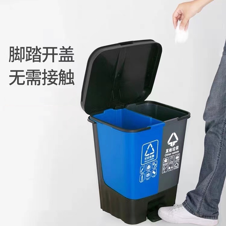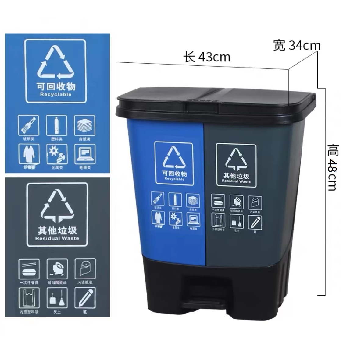 中新 塑料可分类拼色脚踏垃圾桶 430*340*480mm 40L (蓝色+灰色) 可回收物+其他垃圾 双桶