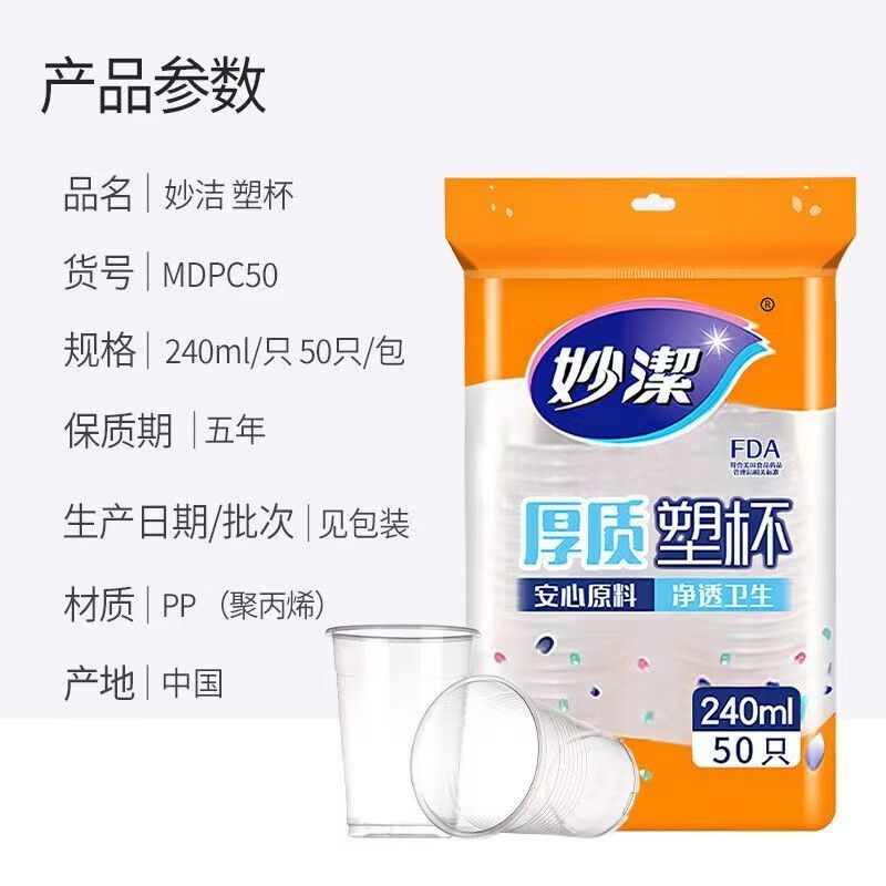 妙洁 加厚一次性塑料杯 240ml(50个/包)